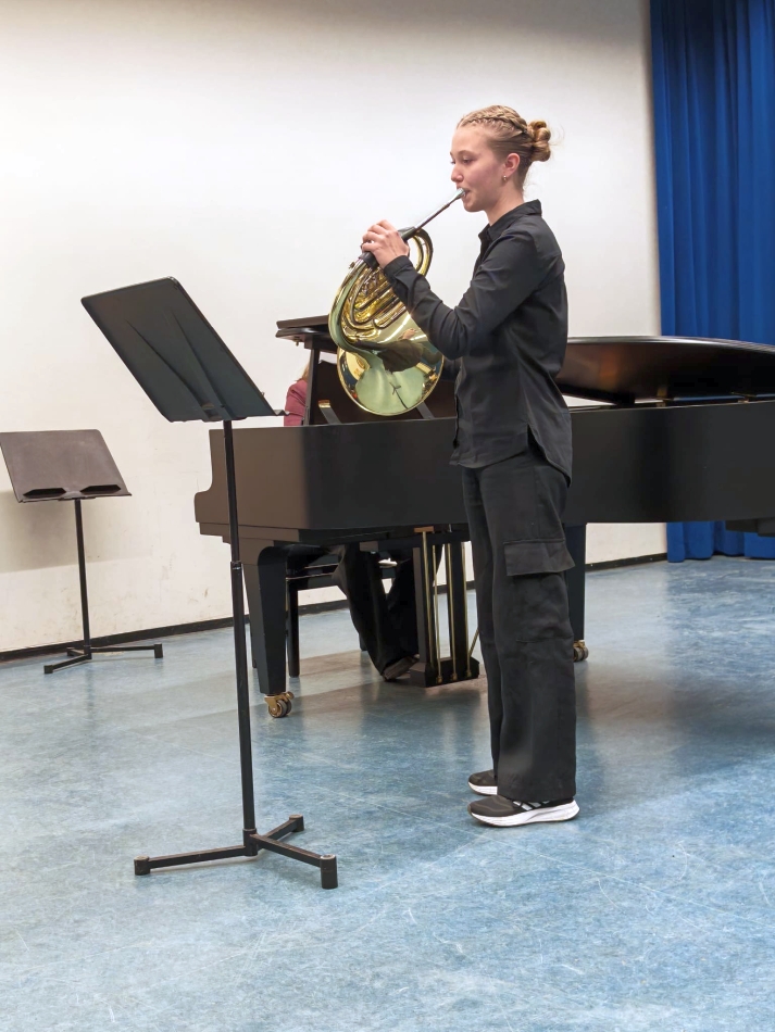 Eröffnet wurde der Abend von Luca Prinz (8c), der mit Silence in You durch gefühlvolles Klavierspiel überzeugte und sofort eine konzentrierte, ruhige Atmosphäre schuf. Magdalena Kirsch (K1) begeisterte anschließend am Horn mit einer klanglich sehr schönen Kirchenarie, die durch ihren warmen Ton und musikalische Gestaltung überzeugte.