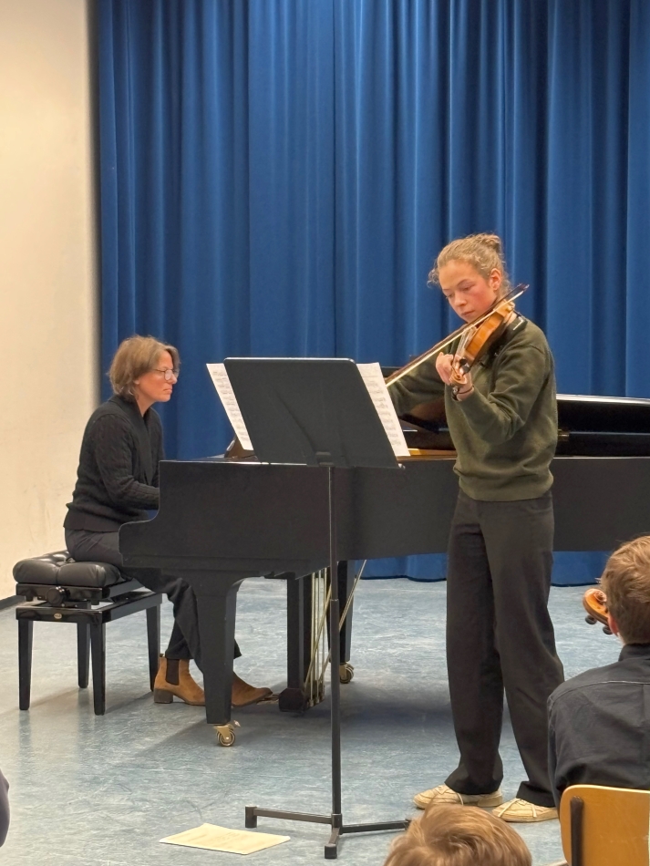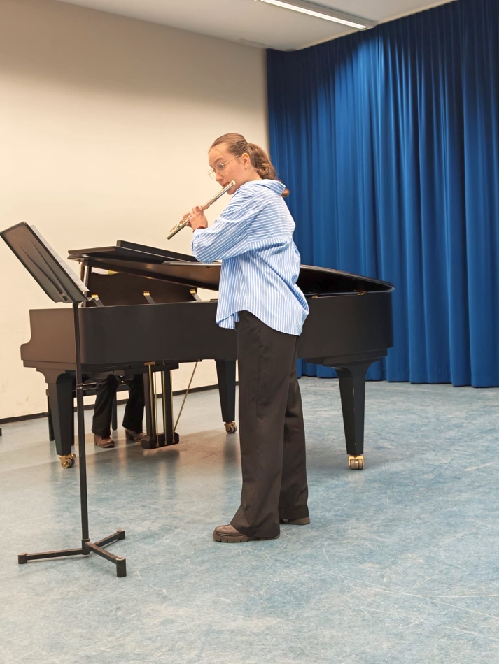Aus der Klasse 7 sorgte Noah Rácz (7a) mit dem anspruchsvollen Violinkonzert von Accolay für große Anerkennung – musikalisch ausdrucksstark vorgetragen. Ein Highlight war auch das Duo aus Querflöte und Klavier: Katharina Müller (K2) interpretierte die Mazurka de Salon mit viel Eleganz und Spielfreude, feinfühlig begleitet von der ehemaligen Schülerin Nanae Sabielny.