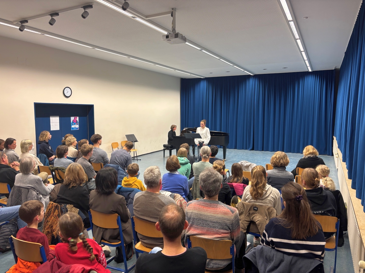 Mit großem Applaus bedacht wurde auch Khalil Köhler (9d), der mit dem hochvirtuosen Präludium von Rachmaninow das Publikum durch Kraft und musikalische Tiefe begeisterte. Den festlichen Abschluss gestaltete Julia Betz (K2) mit Gesang: Auszüge aus Bachs Matthäuspassion sowie aus Offenbachs Orpheus und Eurydike rundeten den Abend eindrucksvoll ab.