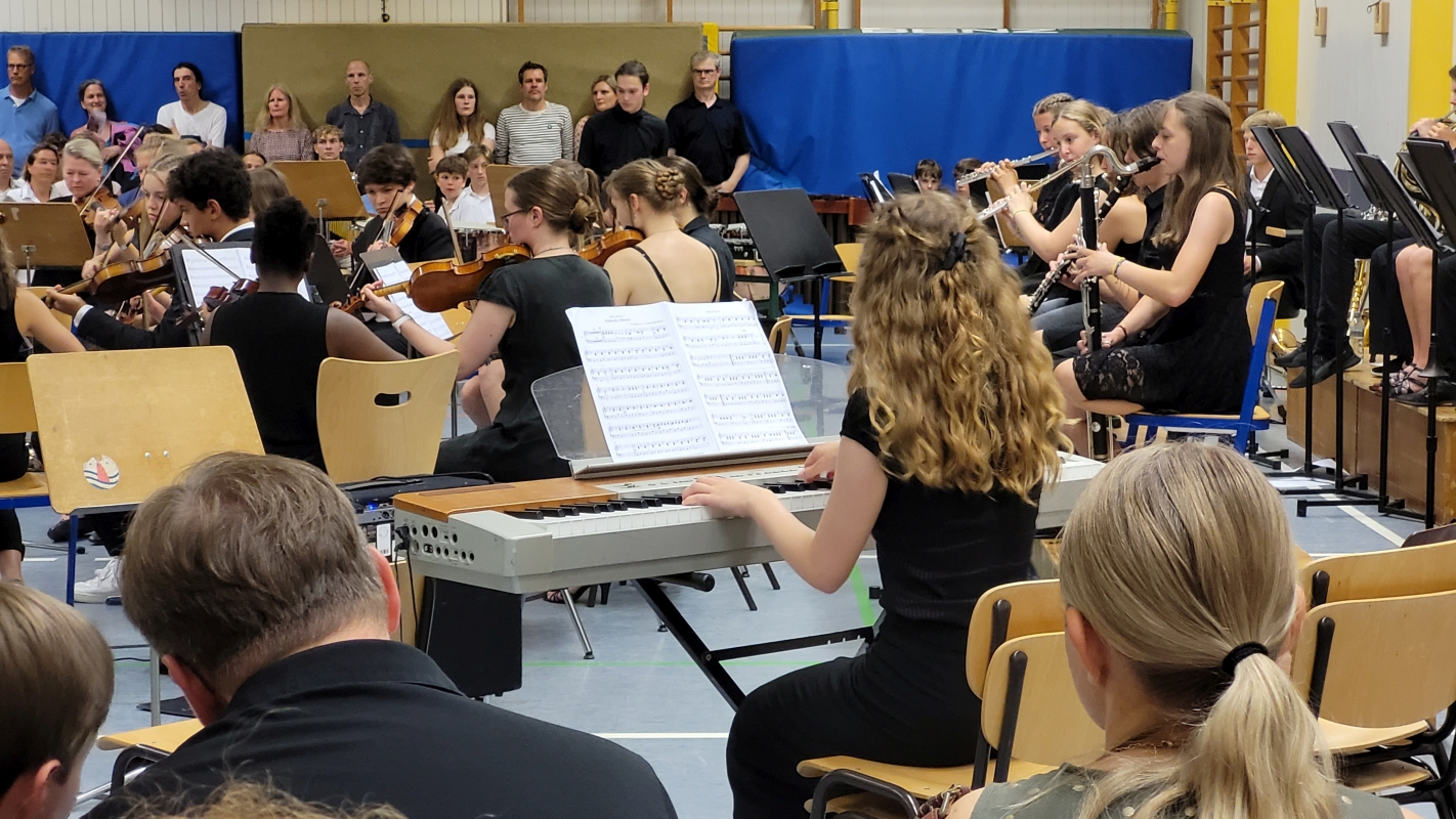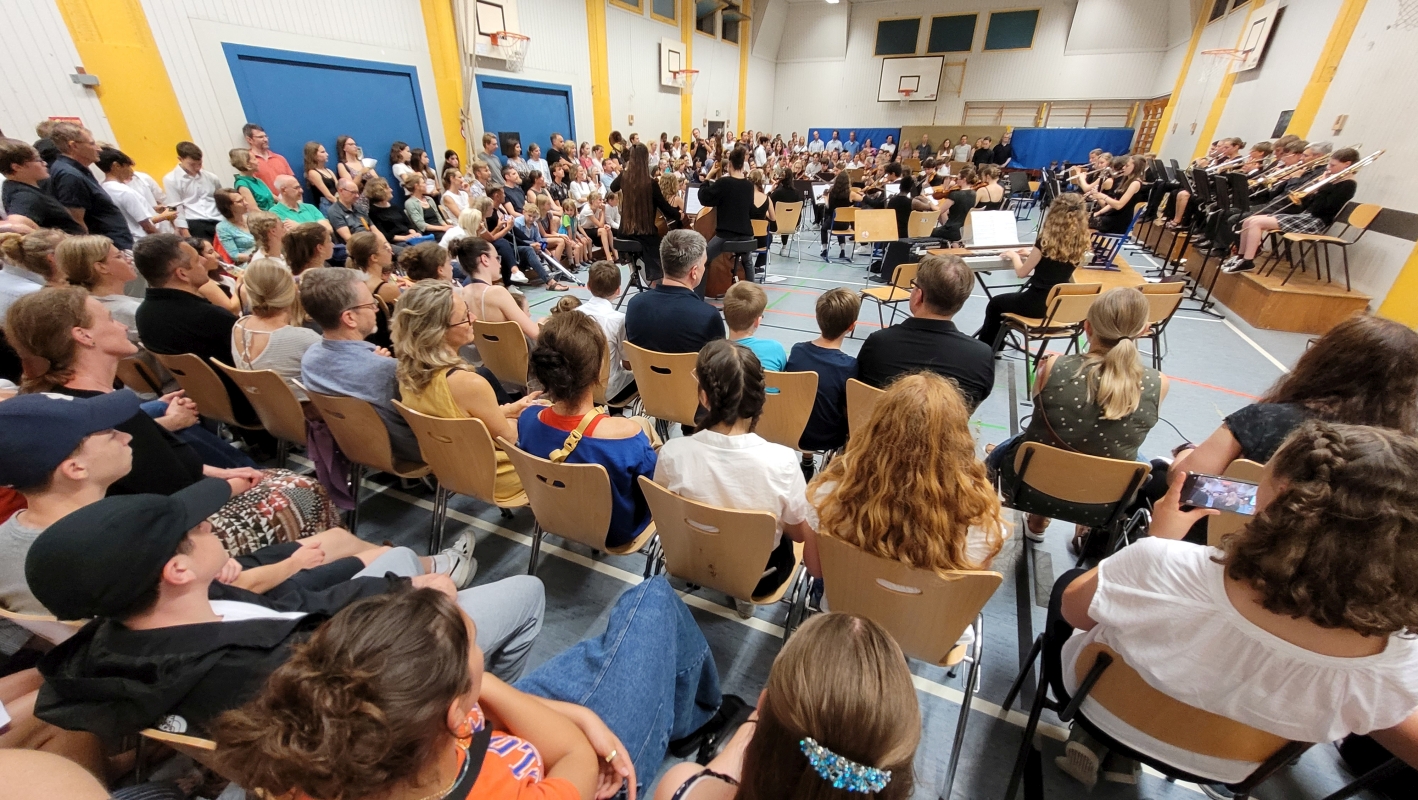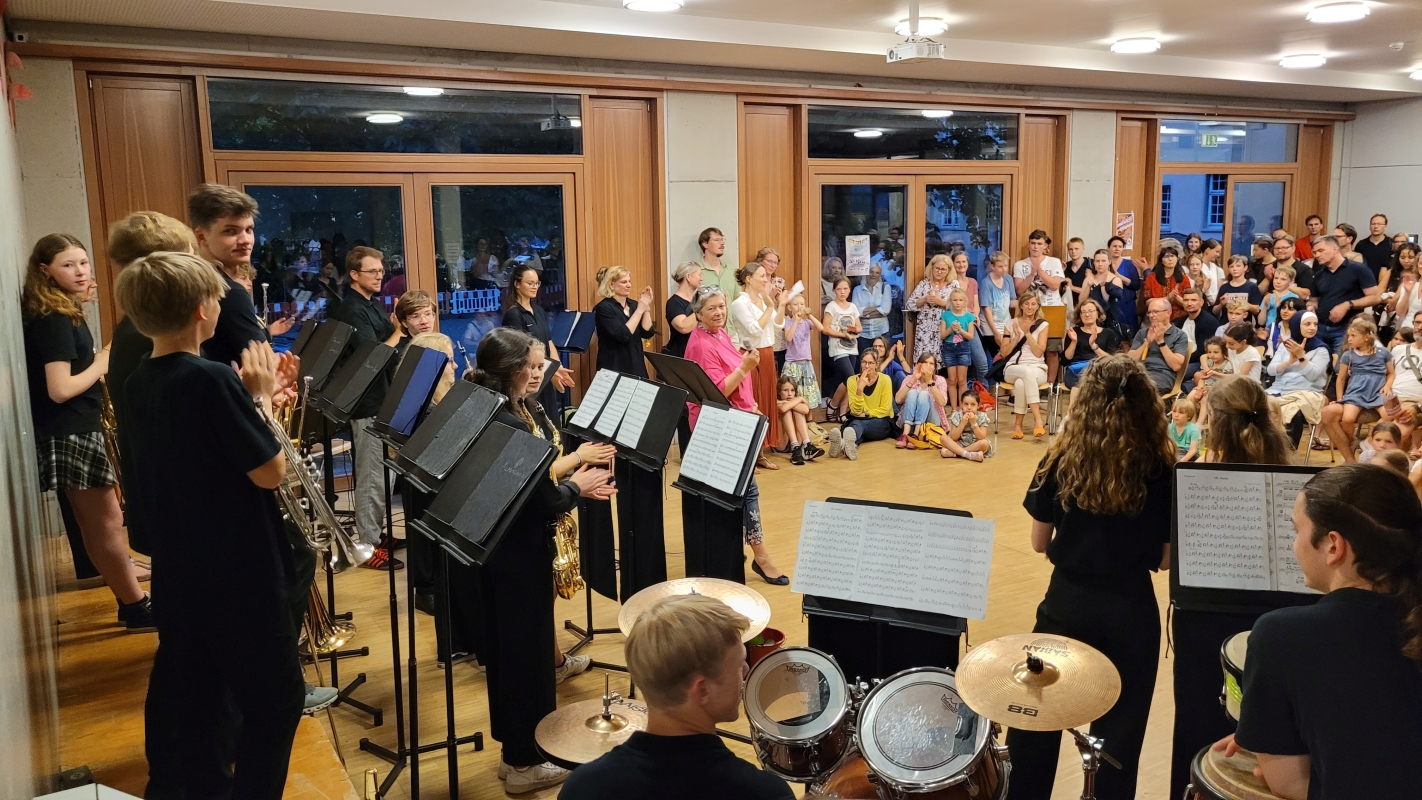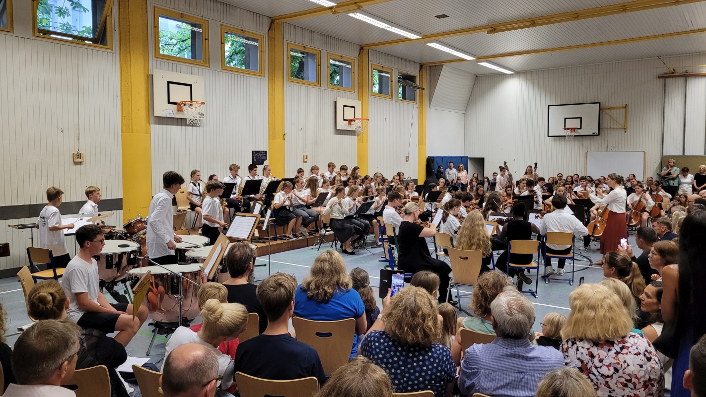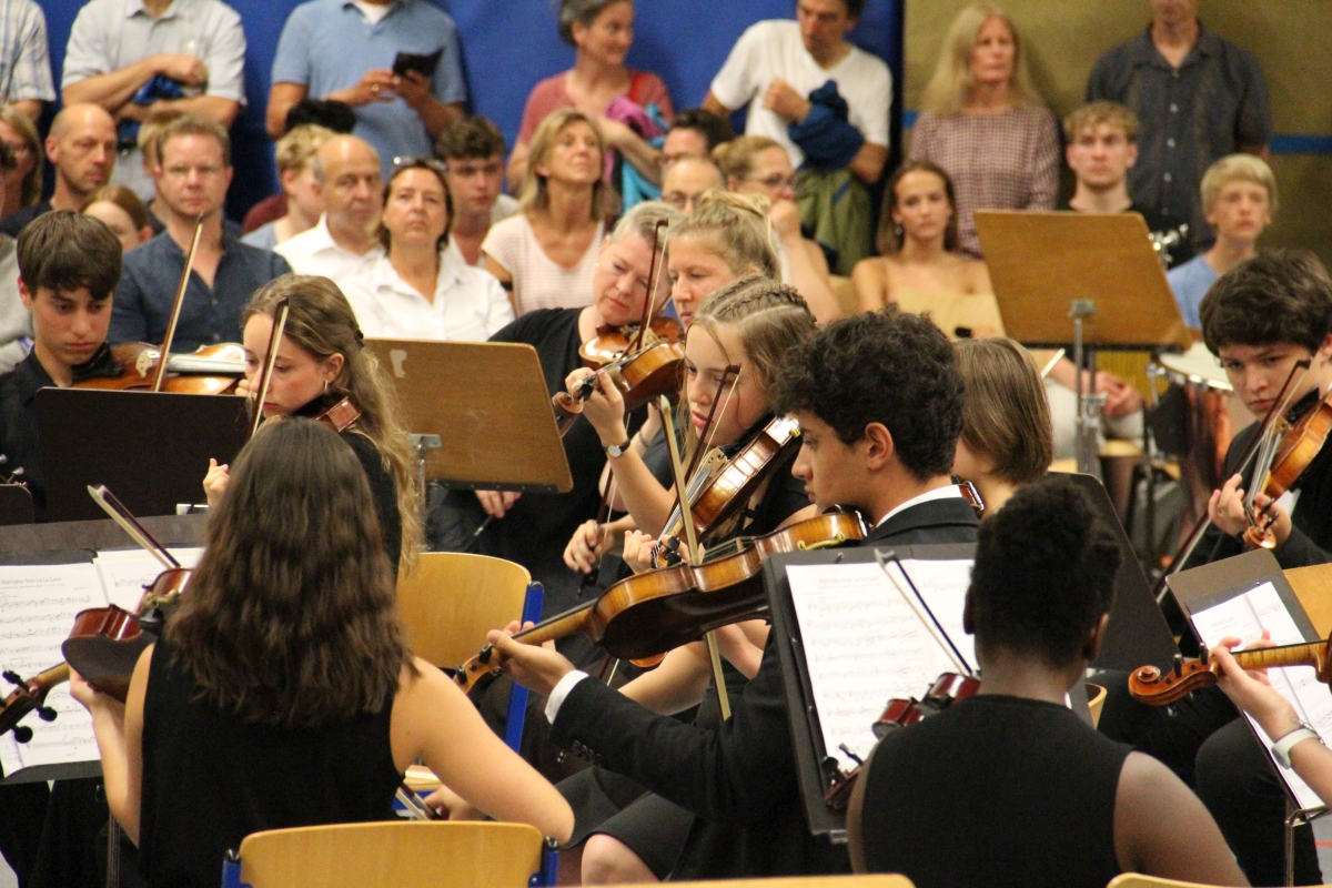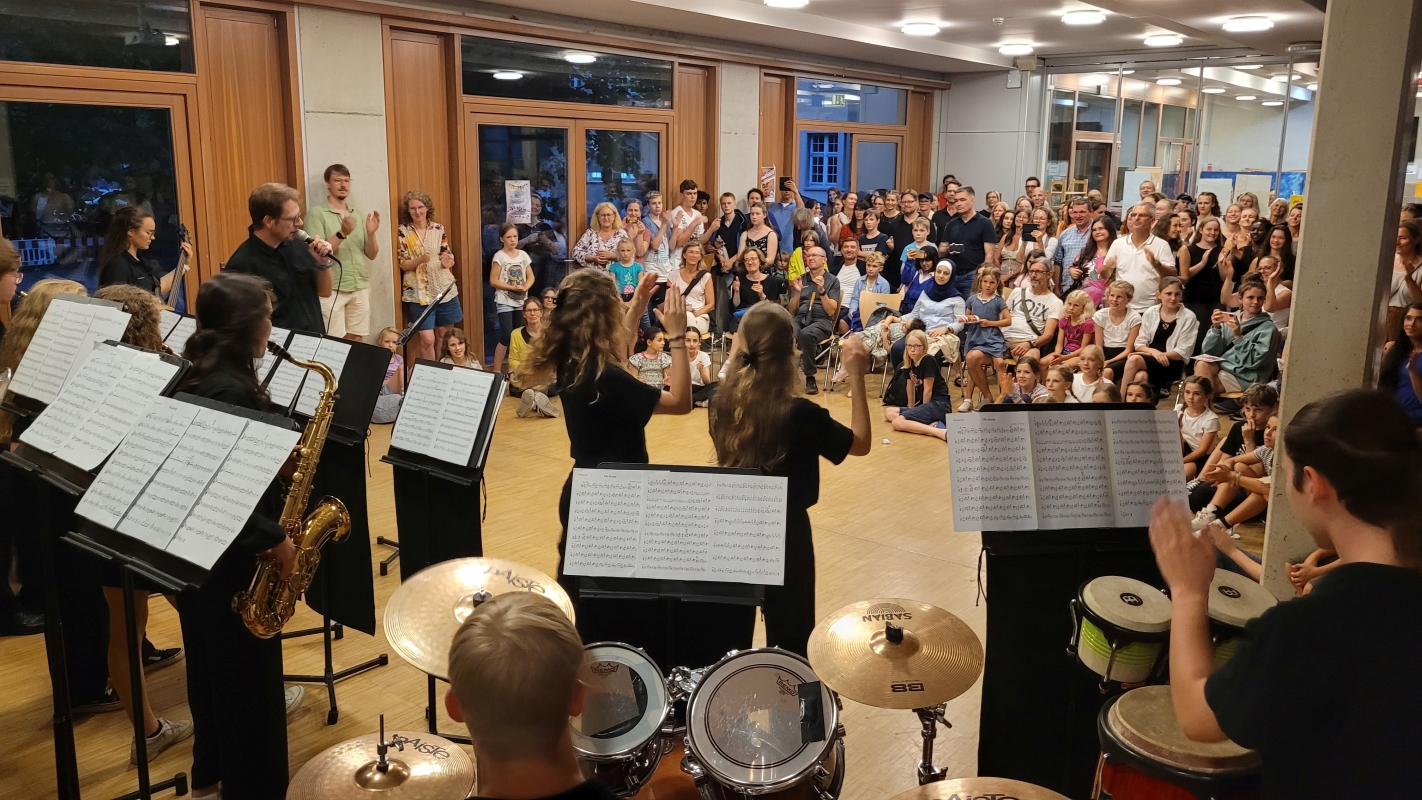 Am vergangenen Mittwoch feierte unser Sommerkonzert eine Premiere: Die Orchester, die Chöre und die Concert Band musizierten an verschiedenen Stationen im Schulhaus. Trotz regnerischer Witterung verbreitete das neue Format ein zwangloses Festivalgefühl: Zwischen den musikalischen Programmpunkten, die mit gewohnter Präzision und Hingabe von Julia Müller, Heiko Sehrig und Diana Winterer einstudiert worden waren, gab es im Rahmen der Ortswechsel Gelegenheit zu Verköstigung und Plausch. Die Abiturient:innen schenkten Getränke aus und auf dem Schulhof traf man sich zu Currywurst und Pommes. So besiedelten Schüler:innen, Eltern und Lehrer:innen das Schulhaus und genossen einen Abend, bei dem neben den musikalischen Fähigkeiten unserer Schüler:innen auch die Schulgemeinschaft am Ellenrieder erlebbar wurde.