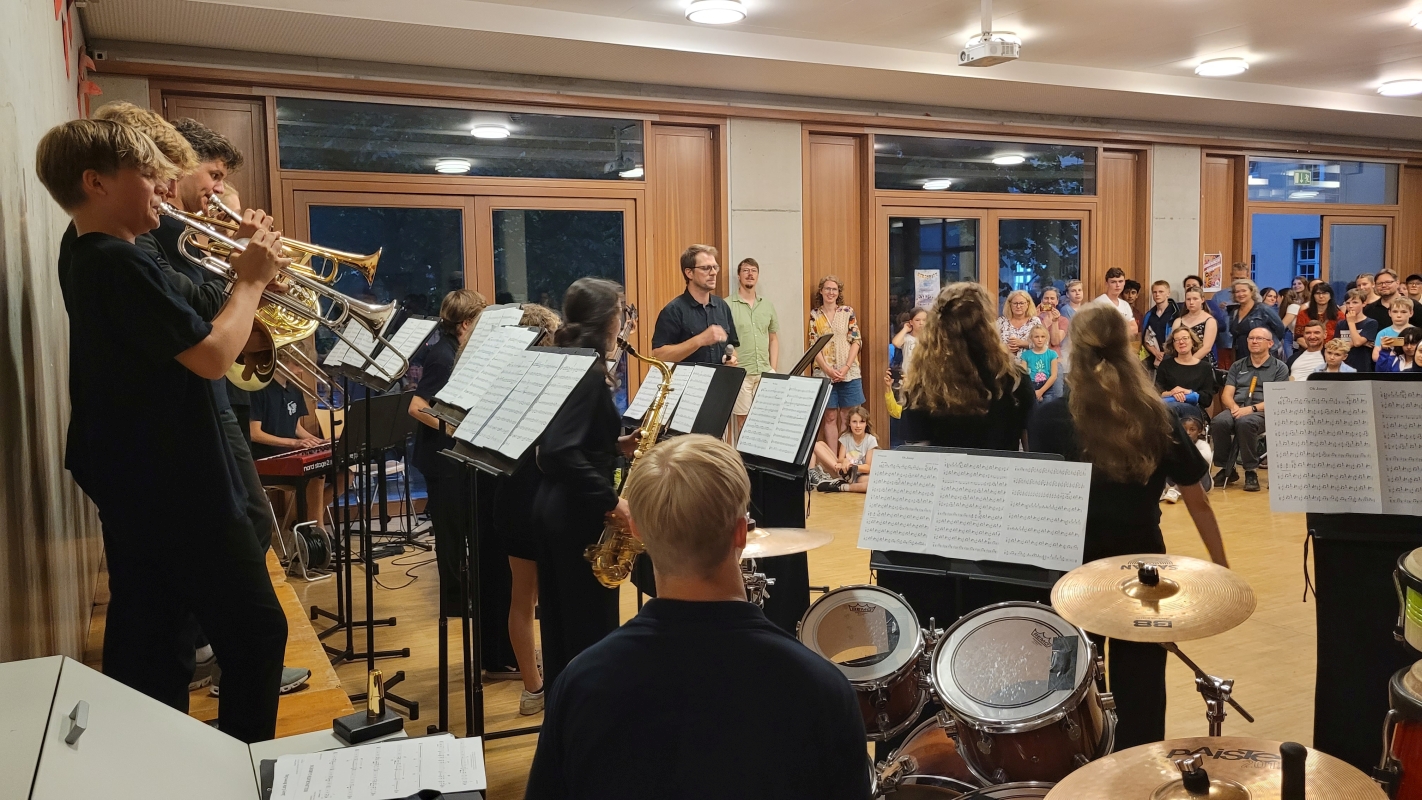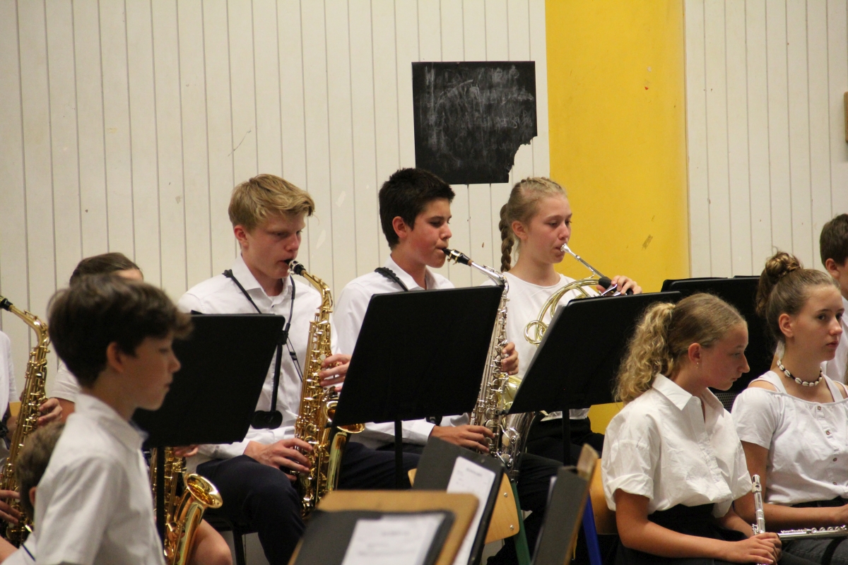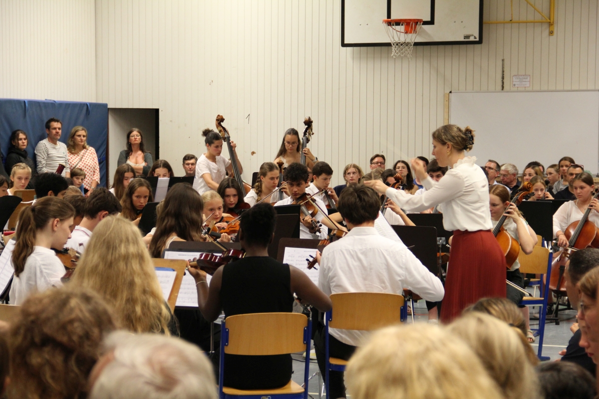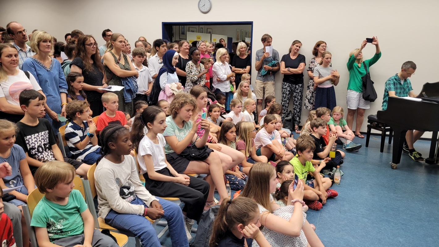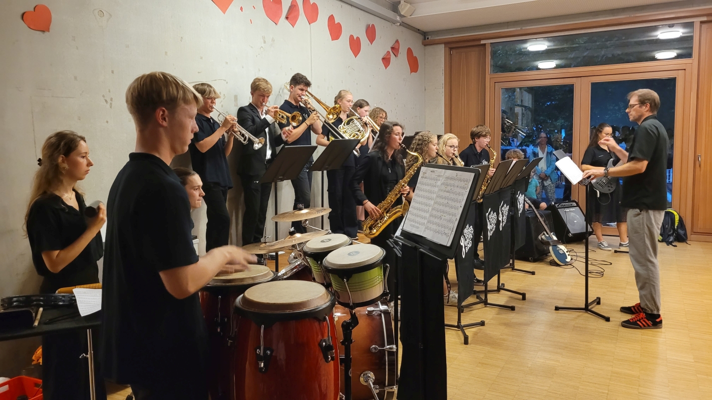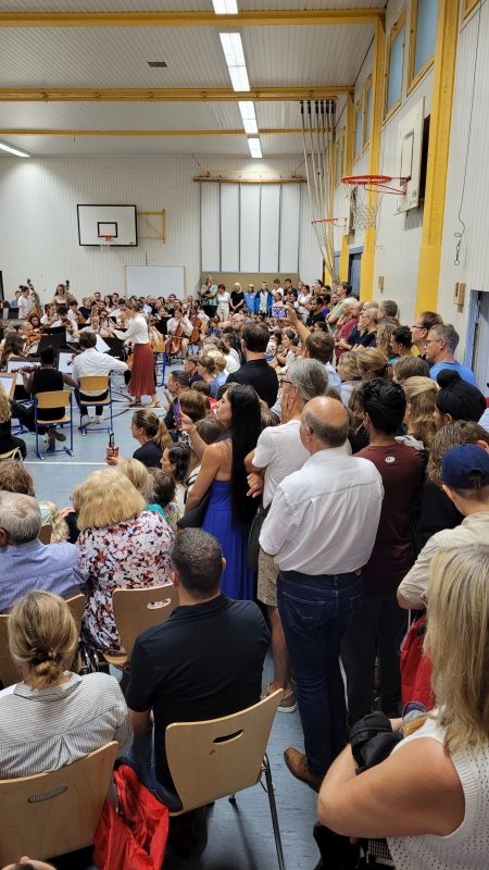 Am vergangenen Mittwoch feierte unser Sommerkonzert eine Premiere: Die Orchester, die Chöre und die Concert Band musizierten an verschiedenen Stationen im Schulhaus. Trotz regnerischer Witterung verbreitete das neue Format ein zwangloses Festivalgefühl: Zwischen den musikalischen Programmpunkten, die mit gewohnter Präzision und Hingabe von Julia Müller, Heiko Sehrig und Diana Winterer einstudiert worden waren, gab es im Rahmen der Ortswechsel Gelegenheit zu Verköstigung und Plausch. Die Abiturient:innen schenkten Getränke aus und auf dem Schulhof traf man sich zu Currywurst und Pommes. So besiedelten Schüler:innen, Eltern und Lehrer:innen das Schulhaus und genossen einen Abend, bei dem neben den musikalischen Fähigkeiten unserer Schüler:innen auch die Schulgemeinschaft am Ellenrieder erlebbar wurde.