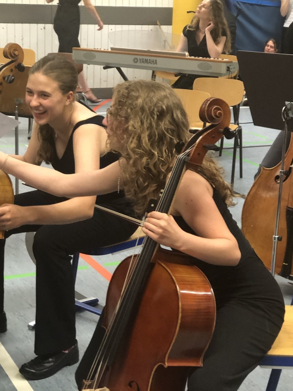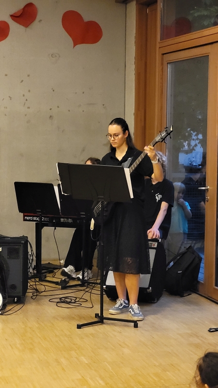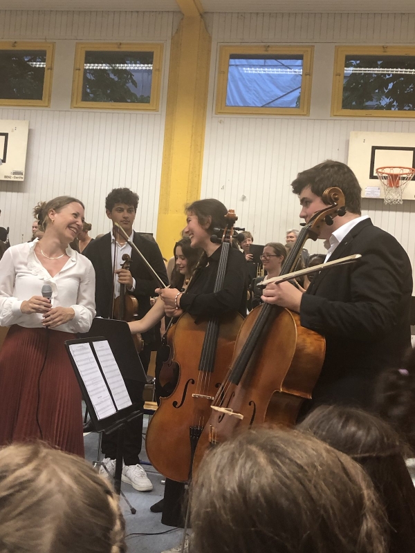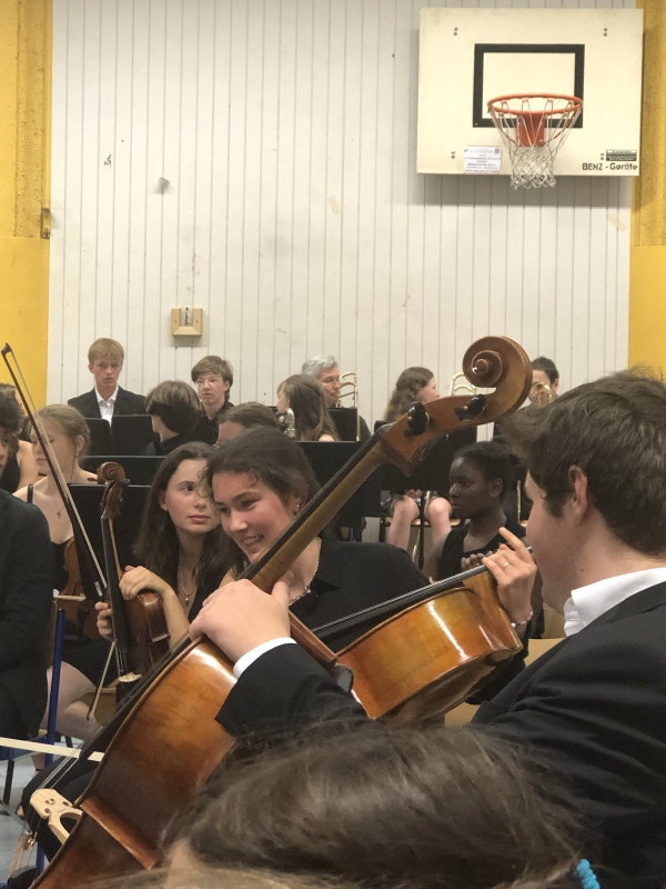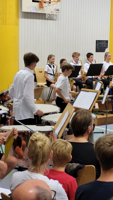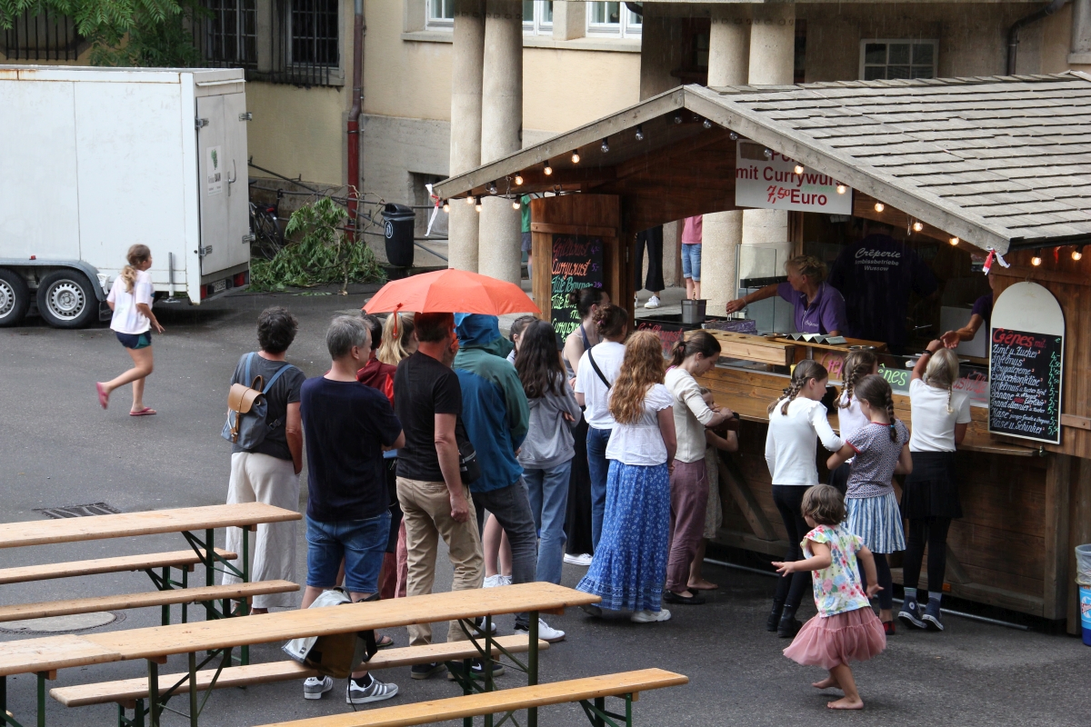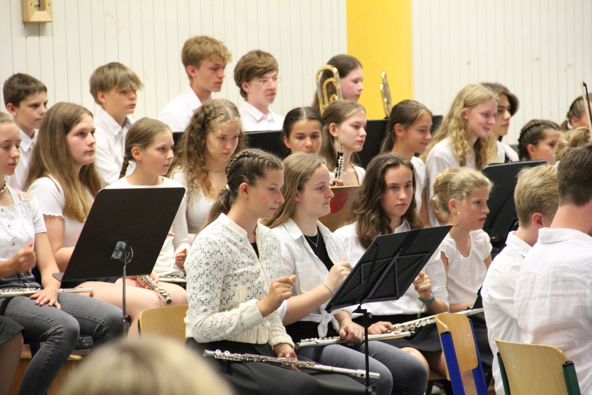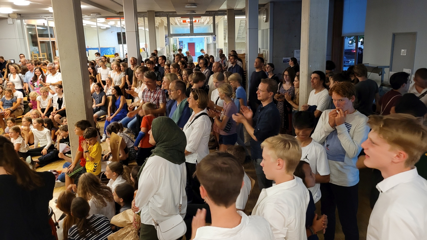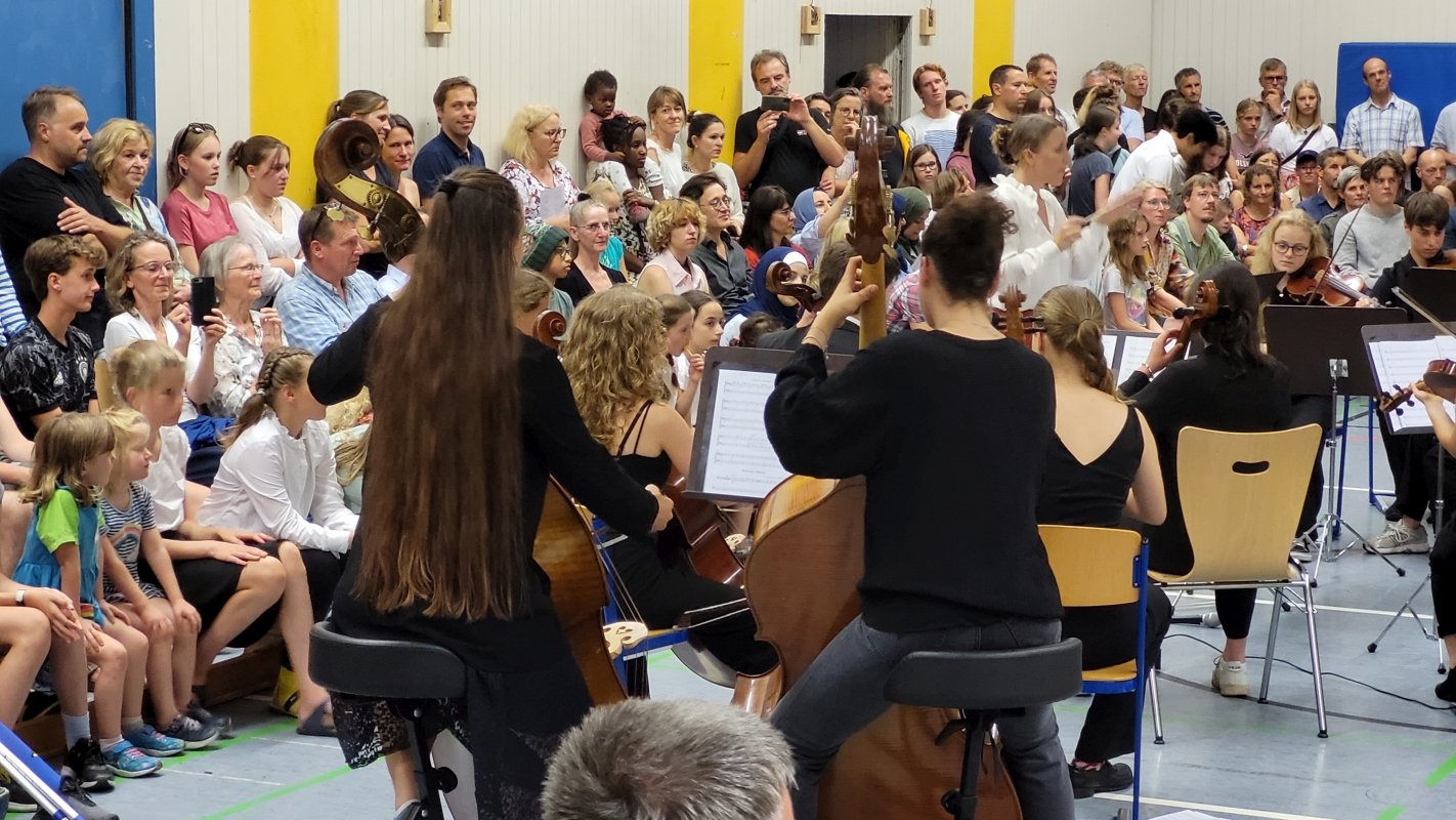 Am vergangenen Mittwoch feierte unser Sommerkonzert eine Premiere: Die Orchester, die Chöre und die Concert Band musizierten an verschiedenen Stationen im Schulhaus. Trotz regnerischer Witterung verbreitete das neue Format ein zwangloses Festivalgefühl: Zwischen den musikalischen Programmpunkten, die mit gewohnter Präzision und Hingabe von Julia Müller, Heiko Sehrig und Diana Winterer einstudiert worden waren, gab es im Rahmen der Ortswechsel Gelegenheit zu Verköstigung und Plausch. Die Abiturient:innen schenkten Getränke aus und auf dem Schulhof traf man sich zu Currywurst und Pommes. So besiedelten Schüler:innen, Eltern und Lehrer:innen das Schulhaus und genossen einen Abend, bei dem neben den musikalischen Fähigkeiten unserer Schüler:innen auch die Schulgemeinschaft am Ellenrieder erlebbar wurde.