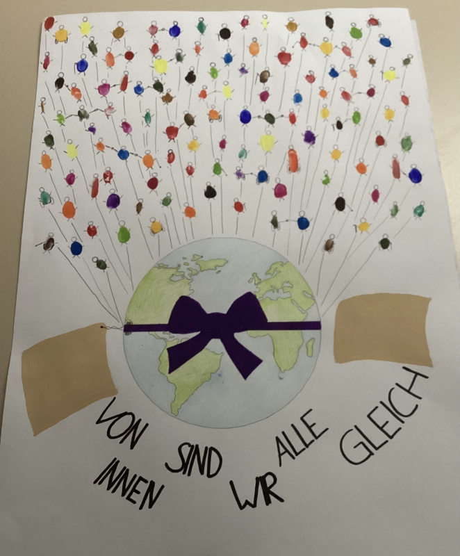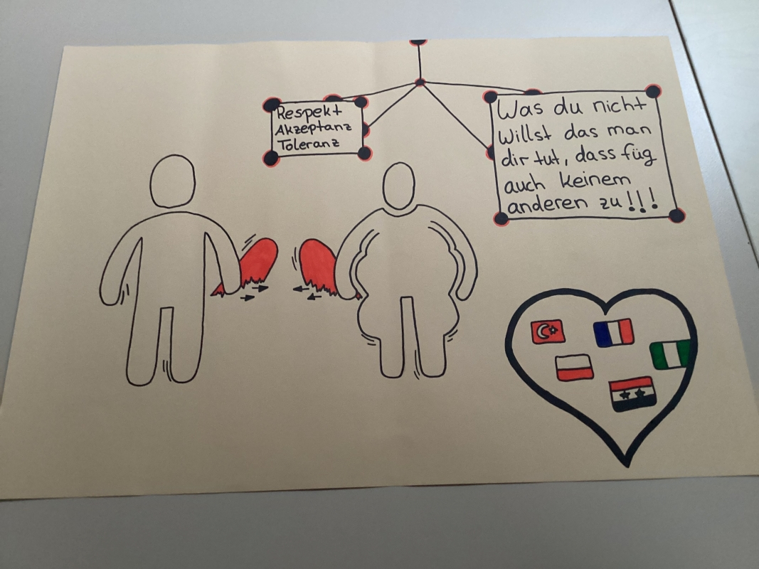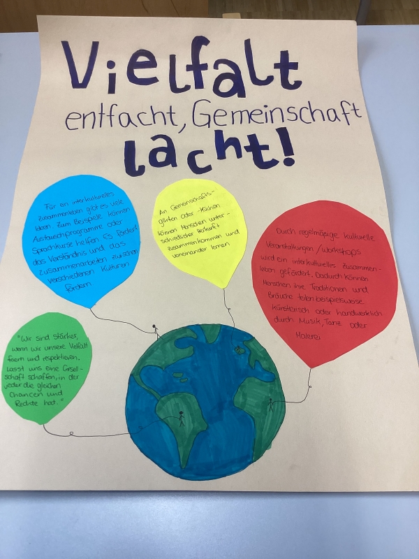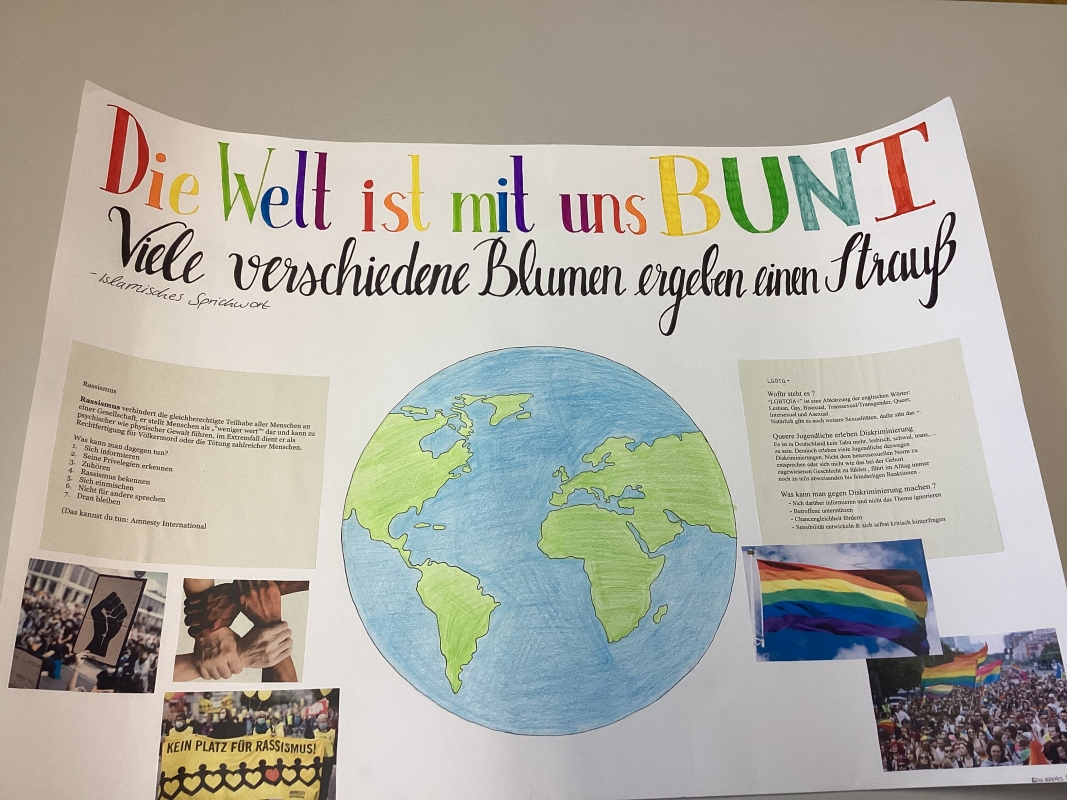 Im Rahmen des 66. Schülerwettbewerbs des Landtags Baden-Württemberg gestalteten die Schülerinnen und Schüler der Klasse 10d Poster zum Thema „Die Welt ist mit uns bunt!“ und entwickelten Ideen für ein interkulturelles Zusammenleben. Alle Schülerinnen und Schüler wurden für ihre Teilnahme am Wettbewerb mit einer Urkunde ausgezeichnet. Besonders überzeugen konnten Jonathan Fried und Benno Seifert. Sie gehören mit ihrem Poster zu den Preisträgern des 66. Schülerwettbewerbs.