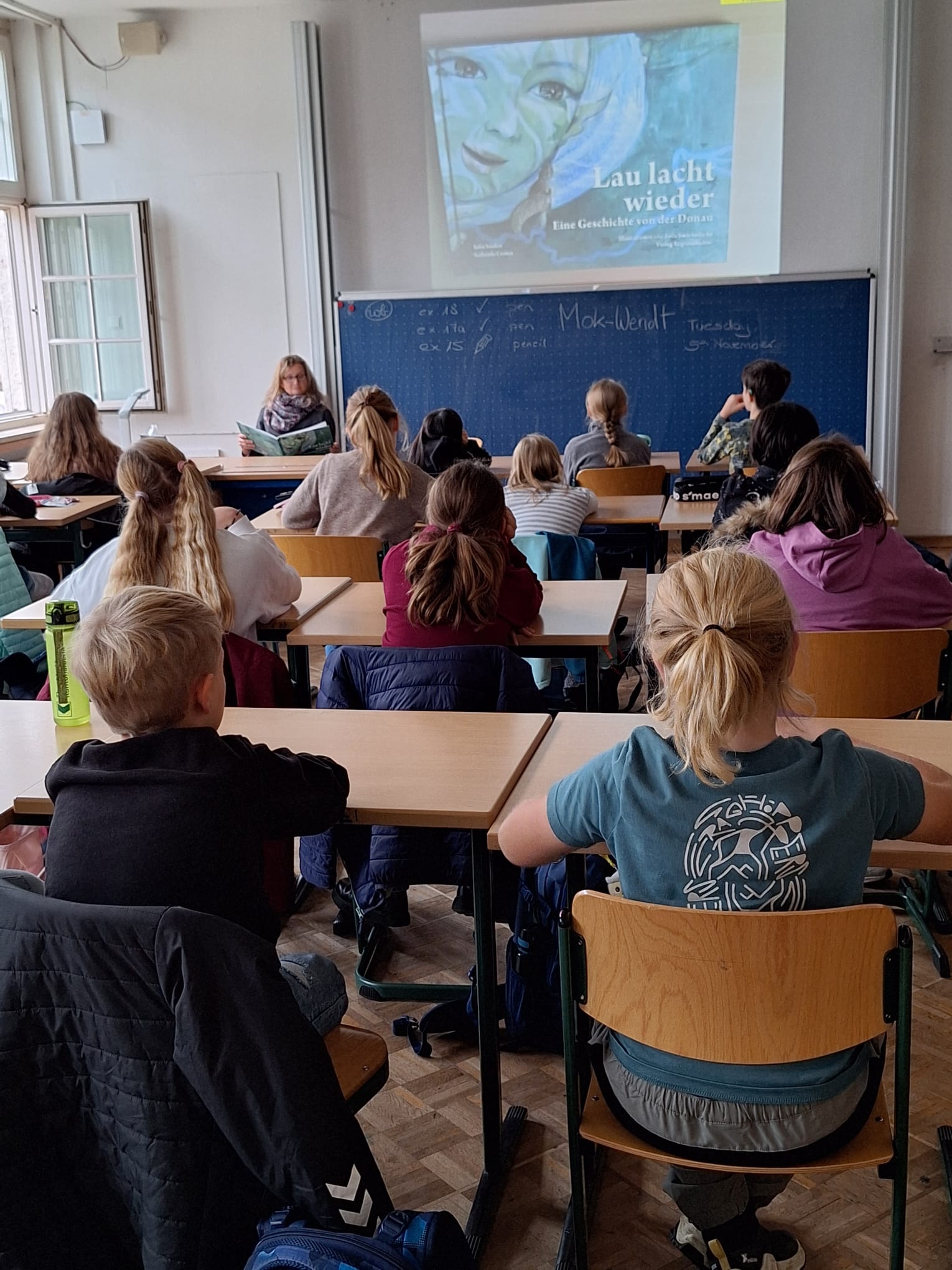 Die Schülerinnen und Schüler der Klasse 5b durften an zwei Tagen die Meerjungfrau Lau auf ihrer Reise vom Quelltopf der Donau bis zum Delta im Schwarzen Meer begleiten. Zauberhaft illustriert wird gezeigt, wie Lau angesichts der Veränderungen der Donau das Lachen verlernt hat, denn der natürliche Lauf des Flusses wurde begradigt, Stauwehre angelegt und das Wasser stark verschmutzt. Auf ihrem Weg lernt Lau viele neue Freunde kennen und sieht, dass es auch Lösungsmöglichkeiten gibt, wie dem Fluss geholfen werden kann, sodass sie letztendlich das Lachen wieder lernt. In diesem Zusammenhang beschäftigten sich die Kinder unter Anleitung der promovierten Philosophin Frau Mok-Wendt mit den Begriffen Respekt, Gemeinschaft, Achtsamkeit und Fürsorge.