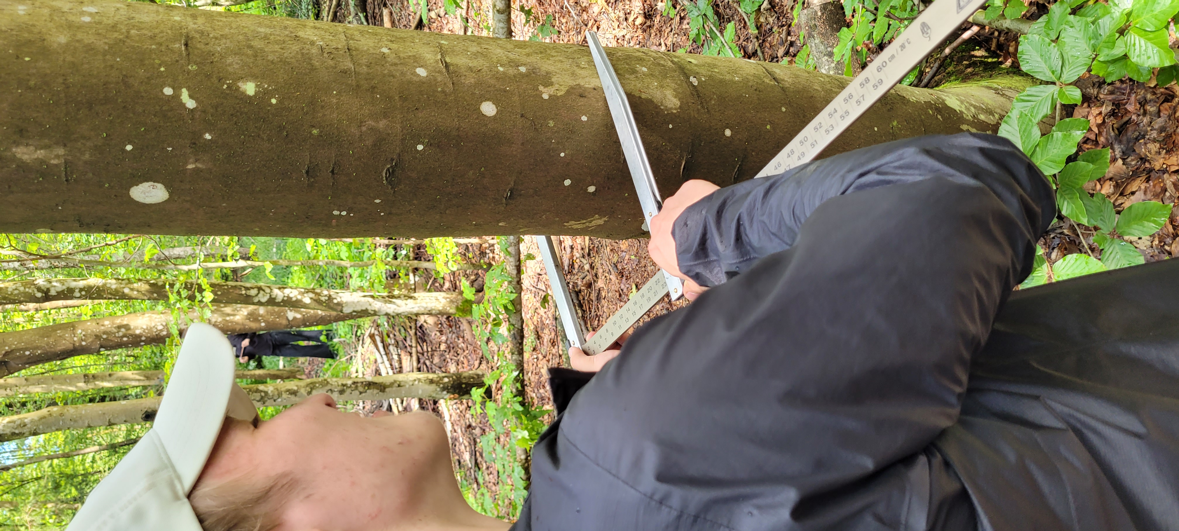 Auf einer Fläche, die dem Pro-Kopf-Anteil Waldfläche in Deutschland entspricht, wurde die Masse aller Bäume bestimmt und daraus berechnet, wie viel CO2 diese Bäume pro Jahr binden können. Das eindrückliche und erschreckende Resultat: Gerade einmal 5-15 % unseres jährlichen CO2-Ausstoßes kann von den Bäumen auf dem von den Schüler:innen vermessenen Waldstück aufgenommen werden.