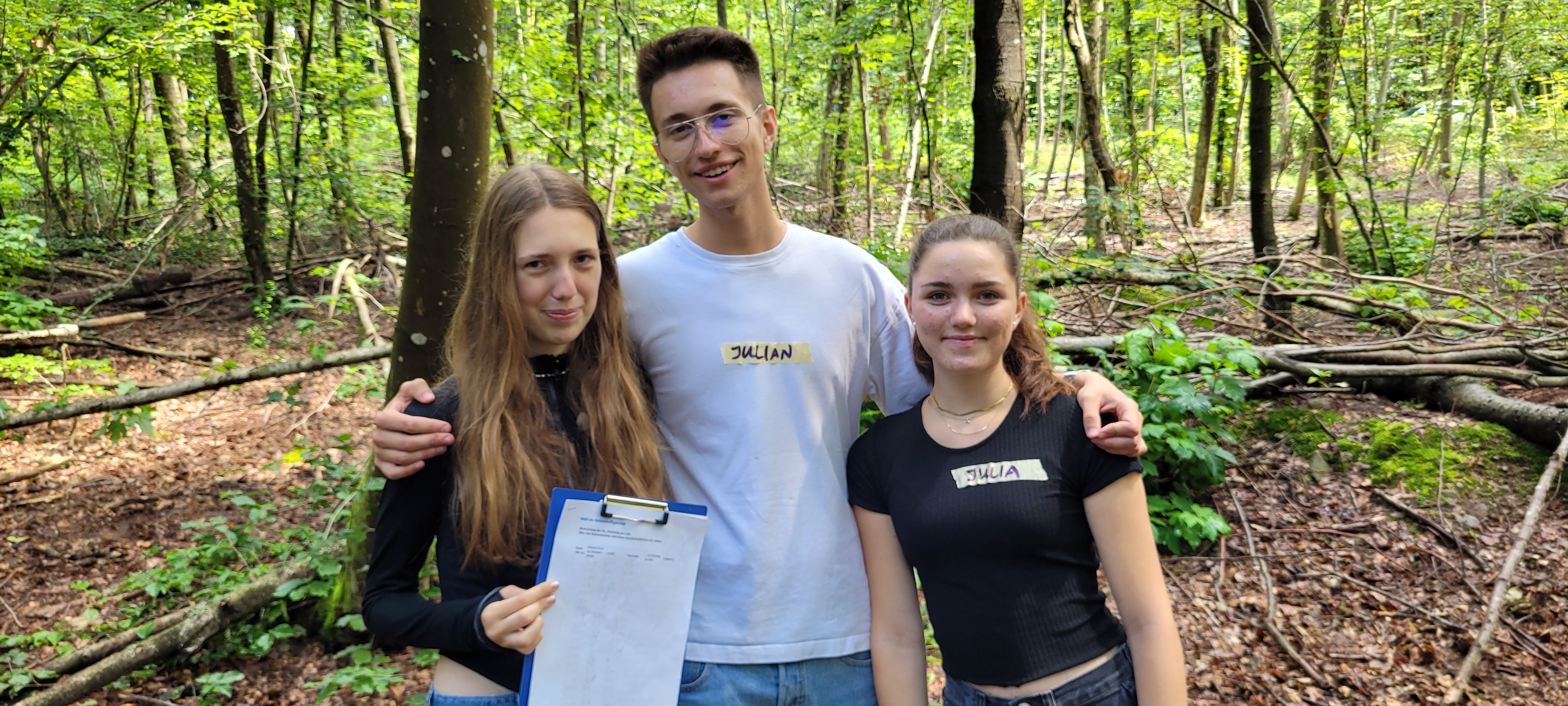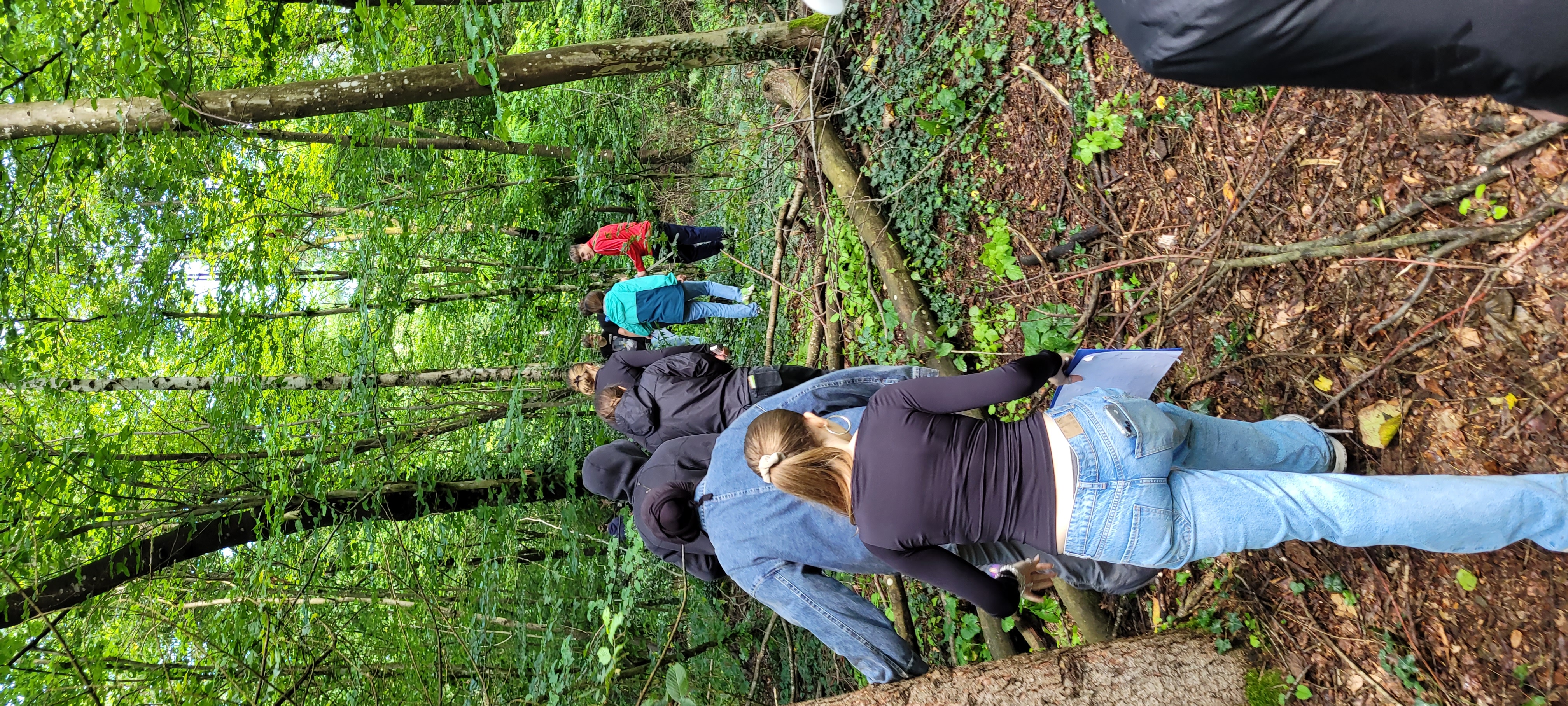 Am Dienstag waren die J1-Schüler:innen der Leistungsfächer Biologie und Biology mit der Försterin, Frau Weißhaupt, und ihrer Praktikantin Pia unterwegs. Neben einer sensorischen Annäherung an den Wald ging es dabei vor allem um das Thema "CO2-Fußabdruck".