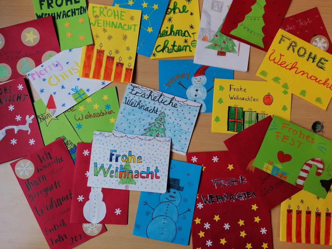 Schüler*innen der Klassen 6, 7, 10 und 12 haben für die Bewohner*innen des Seniorenzentrums "Im Paradies" Margarete Blarer 90 Weihnachtskarten gestaltet und kleine Briefe geschrieben, die dort an Heilig Abend verteilt werden.