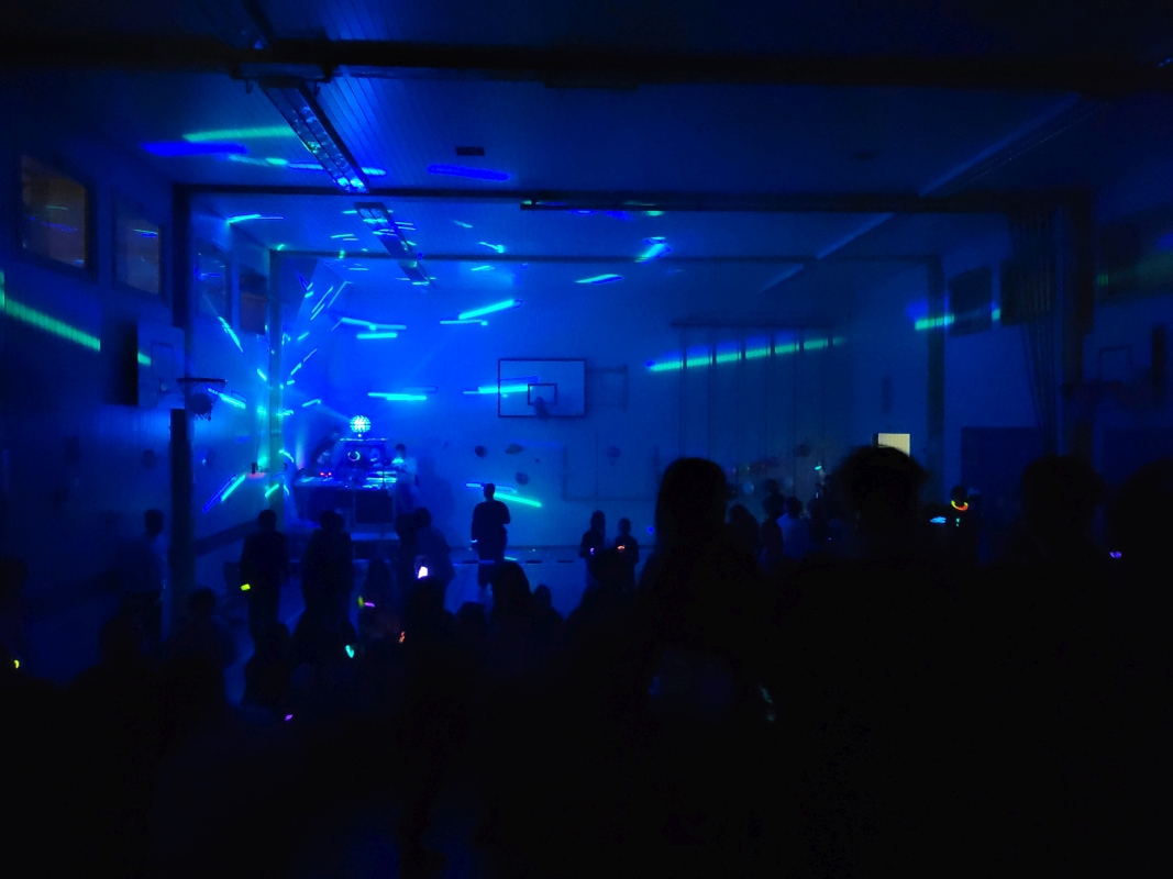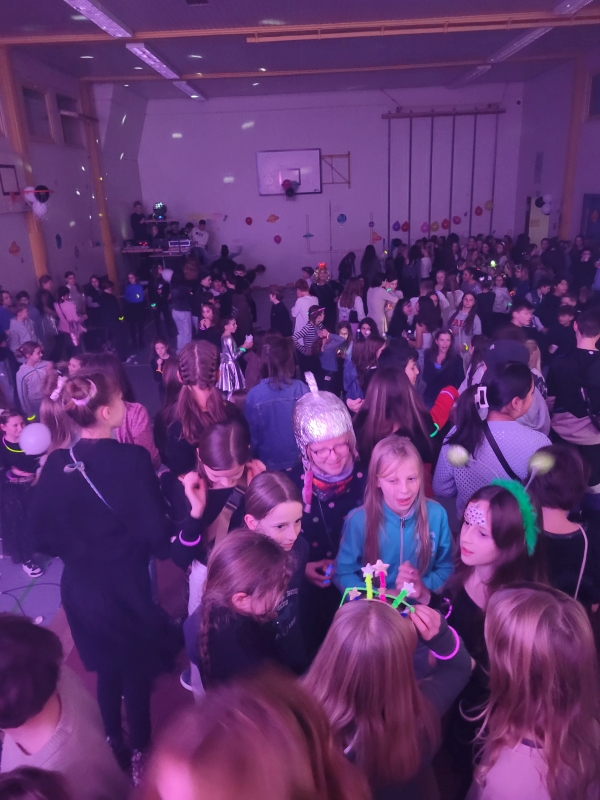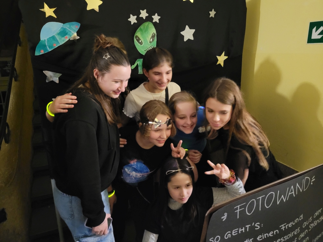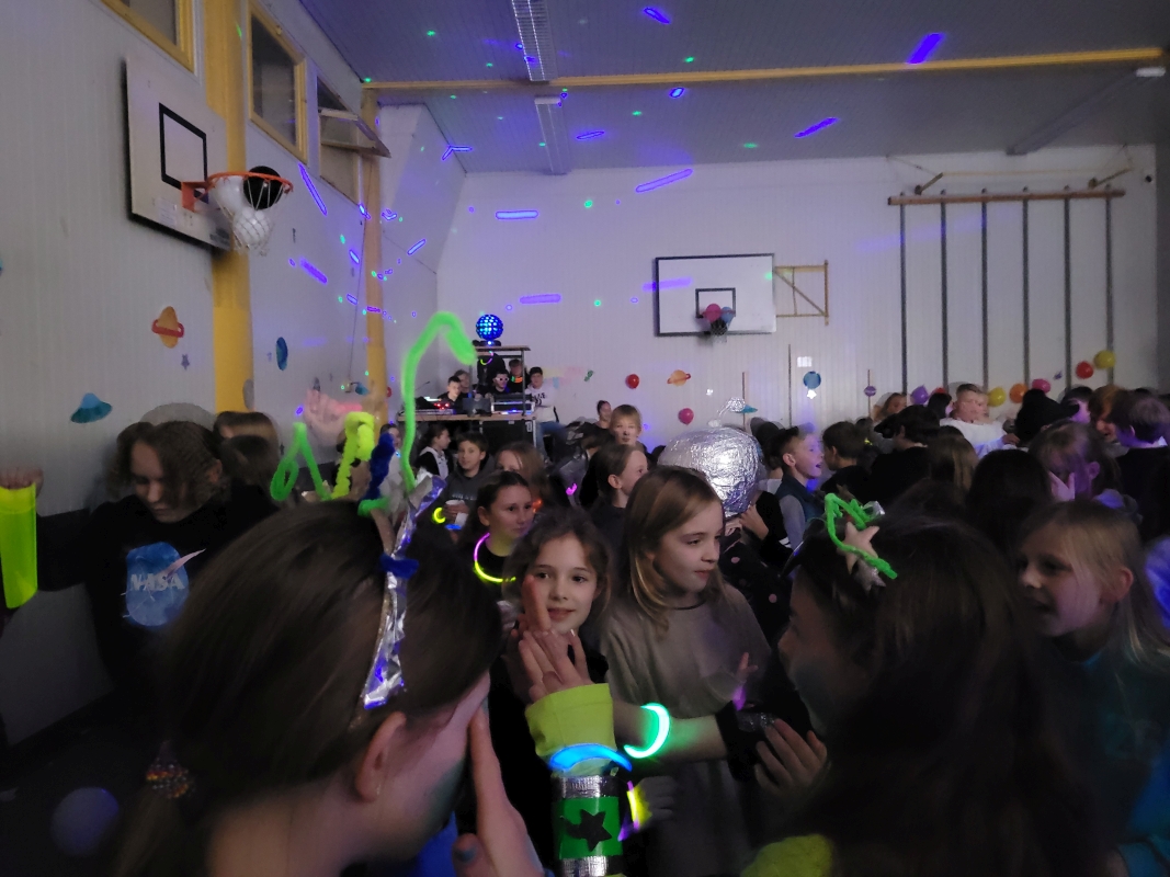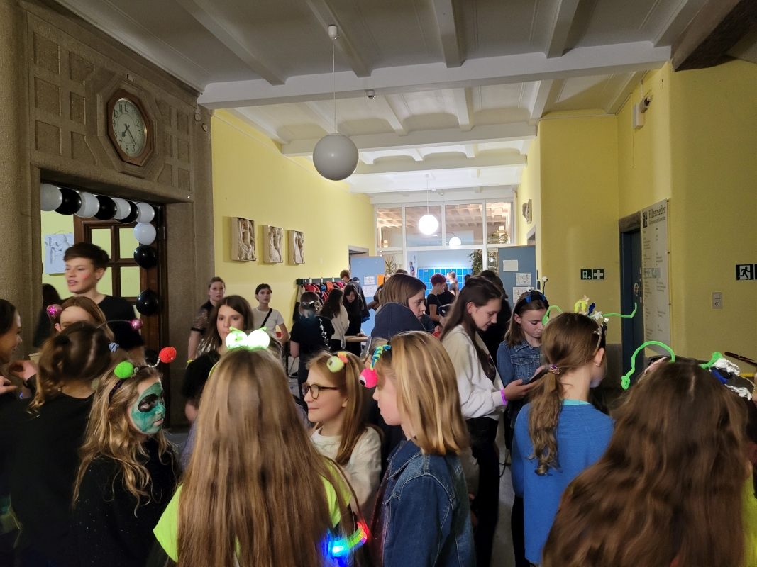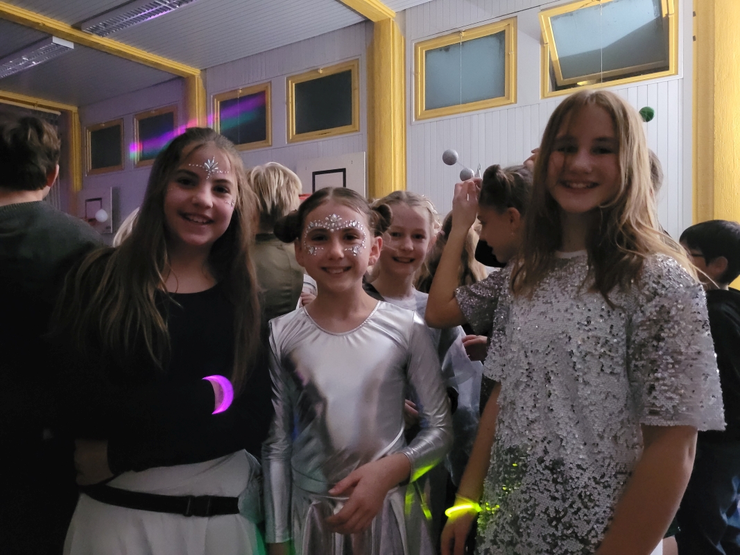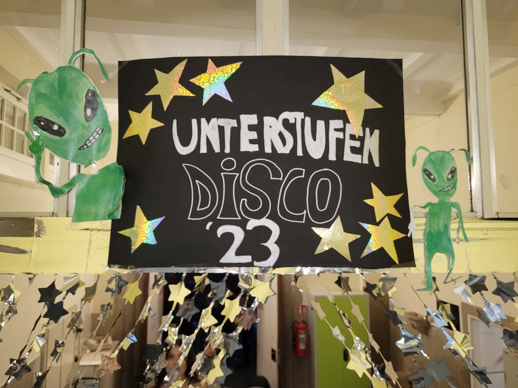 Am vergangenen Freitag fand unsere Unterstufen-Disco unter dem Motto "SPACE" statt. So tummelten sich ab 18.00 Uhr zahlreiche Aliens mit blinkenden Augen, grünen Gesichtern und glitzernden Gewändern zu den Beats der Technik-AG in der Ellenriederhalle.