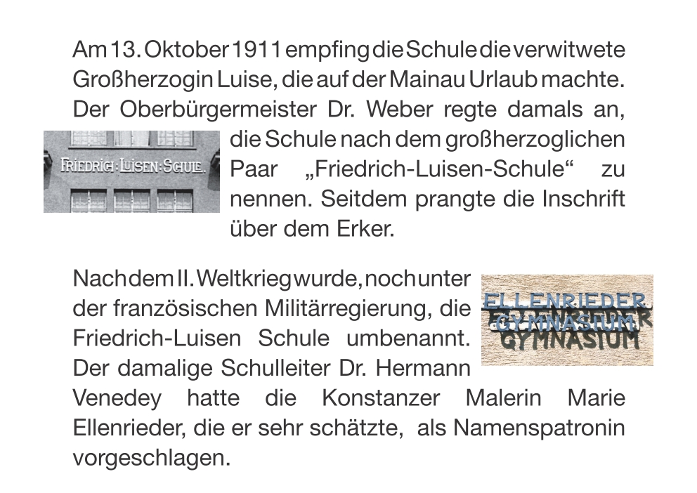 Im Schuljahr 2015/16 produzierte der 4-stündige Geschichtskurs in den letzten Schulwochen vor dem Abitur eine Dokumentation, in der anhand von Bildern, Dokumenten und Spielszenen deutlich wird, wie eng die Geschichte des Ellenrieder-Gymnasiums mit dem Zeitgeschehen der vergangenen hundert Jahre verknüpft war.